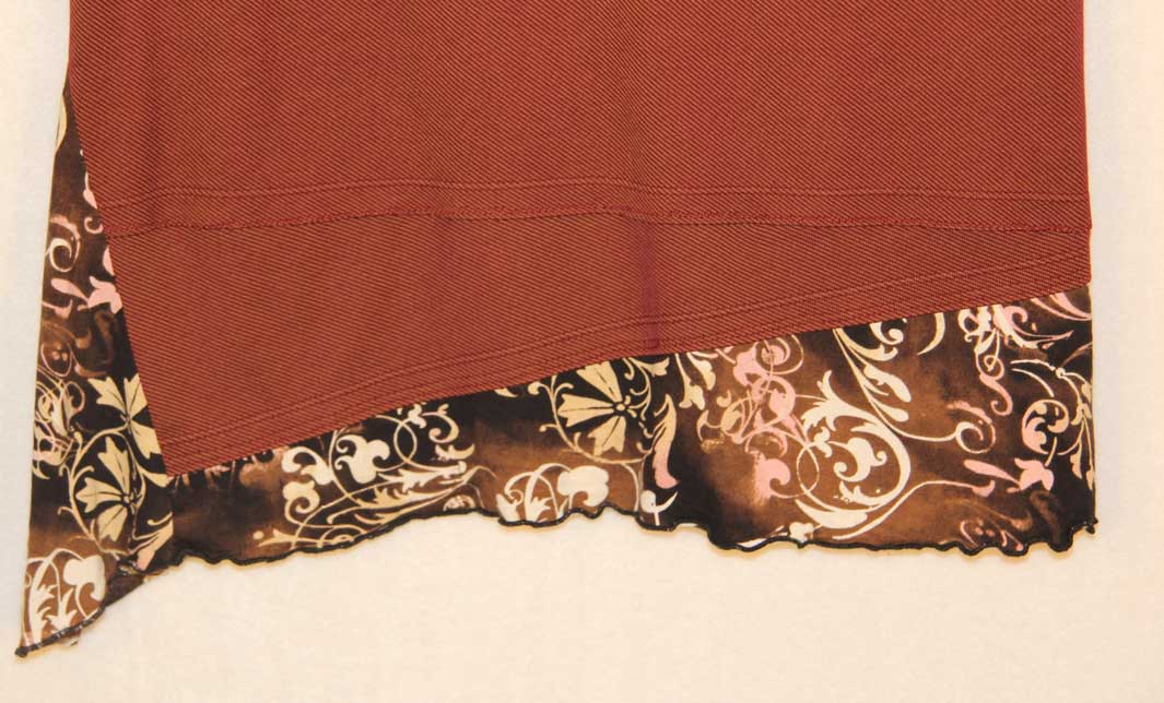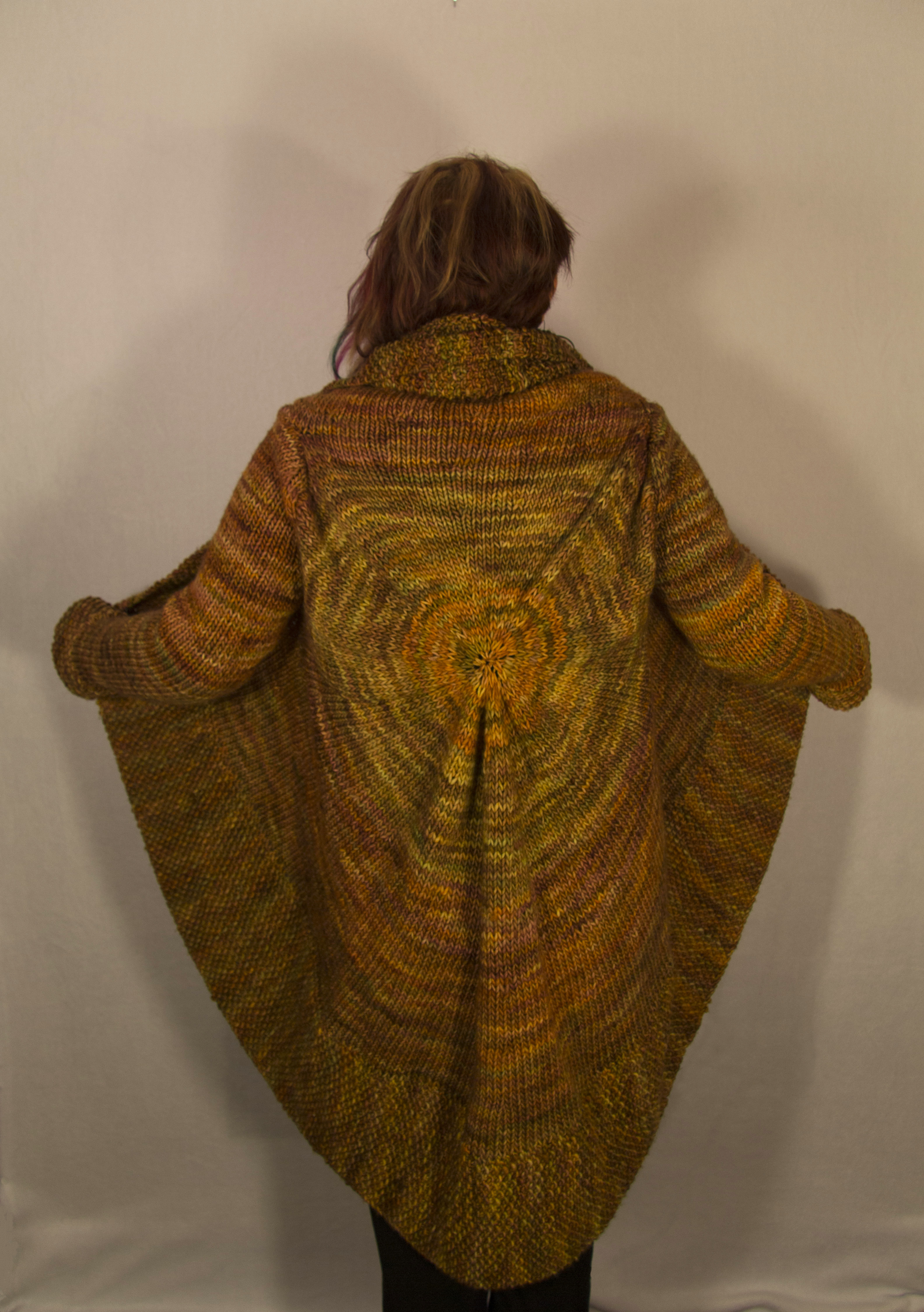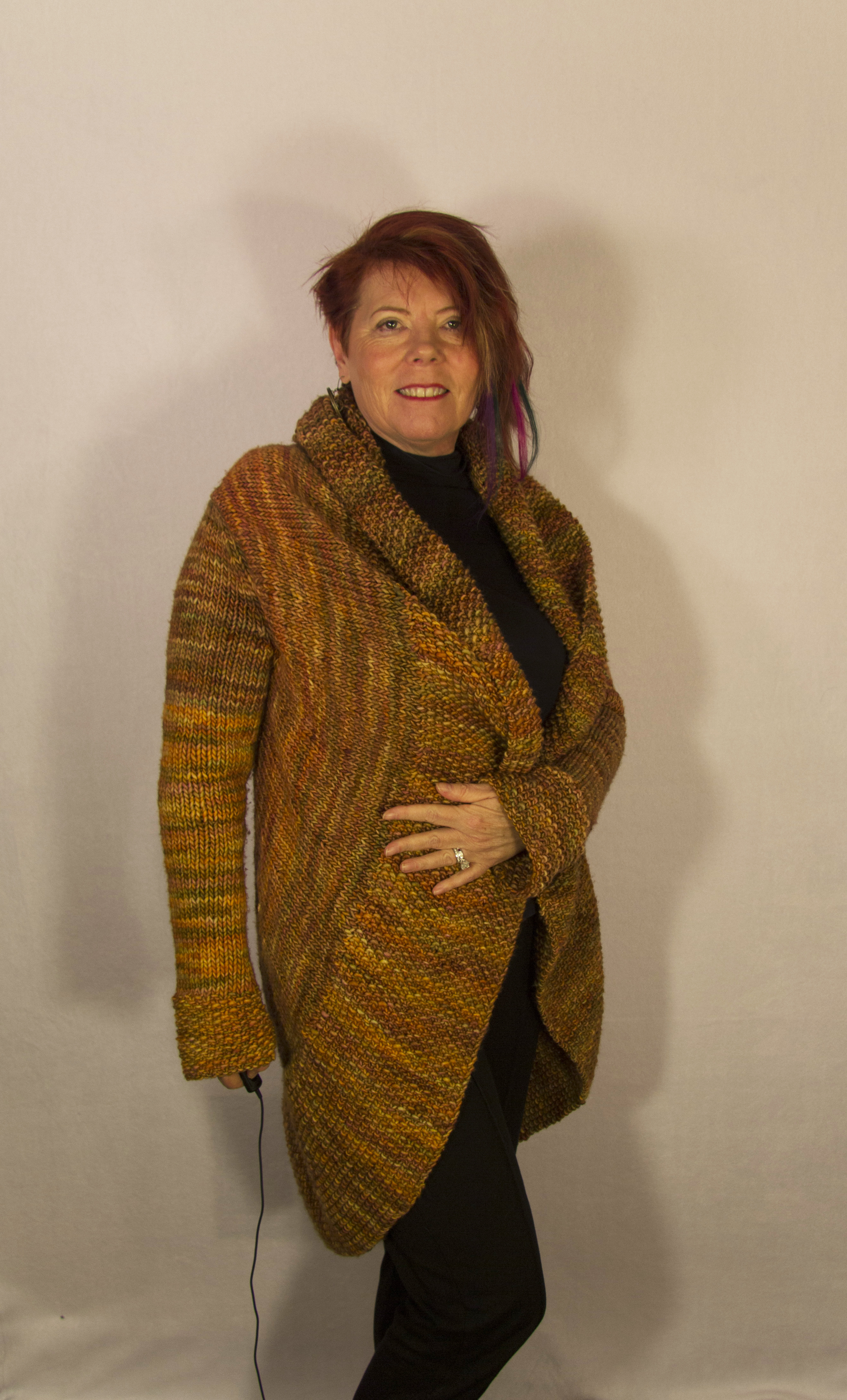The front panels are blocked to the same length, but the piece knitted sideways has a natural stretch making the panel longer forming an asymmetrical silhouette.