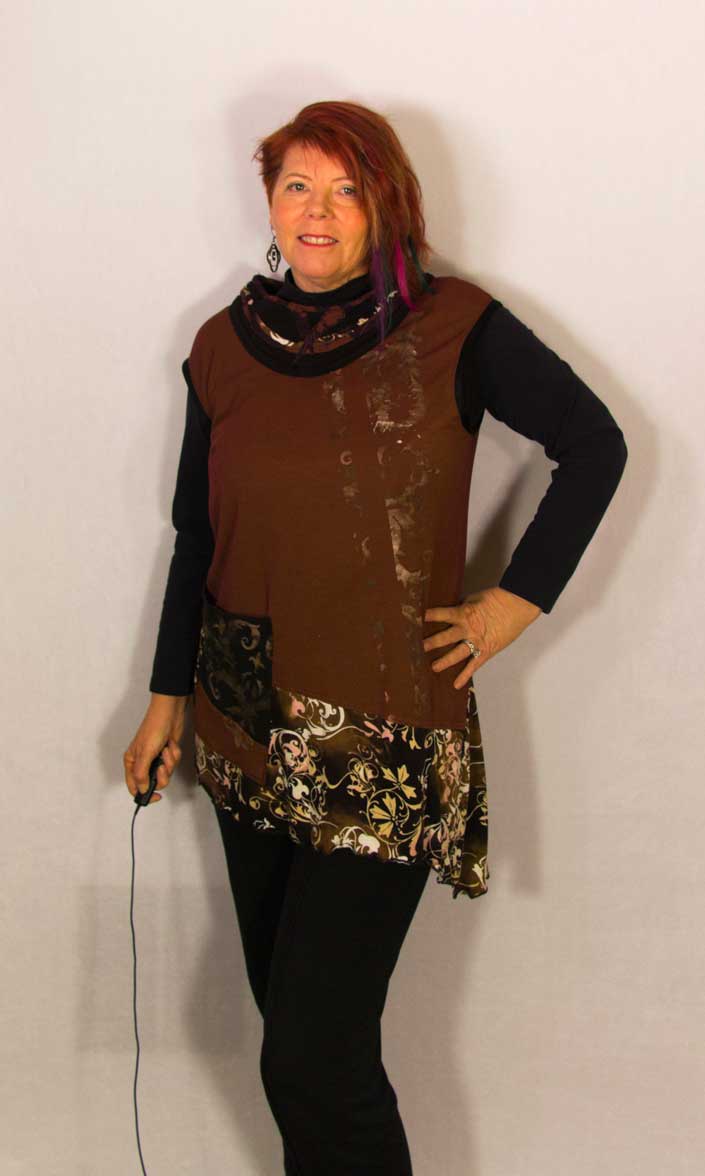 I didn’t use a pattern, but I’m sure there is a similar one out there at Ravelry.com. A simple rectangle, folded in half, I wear around the house all the time. I did add a garter stitch edge to keep the stockinette from curling, but I suspect the curl would have looked fine.