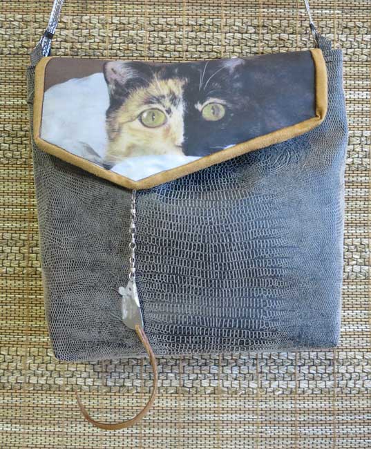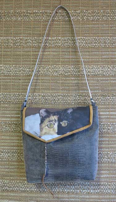 My BSF Debra and I got together to make handbags, and what fun we had! Inspiration for these bags came from multiple sources and came together for a couple of cool purses…at least we think they are cool! My small bag features my cat Ichi who is a walking piece of graphic design. I copied the photo onto cotton ink jet prepared fabric.