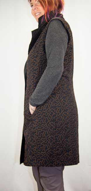 I know I just posted a black vest refashion. While it came out well, it isn’t an everyday throw-on piece. This vest started out with an embroidered stretch denim fabric that should, in theory, work for everyday. Of course my copper silk scraps looked so good I had to make the cool button band detail. In addition the only lining fabric in my stash that looked perfect is a dupioni silk. I did wash the silk first so I can still throw this vest in the washer.