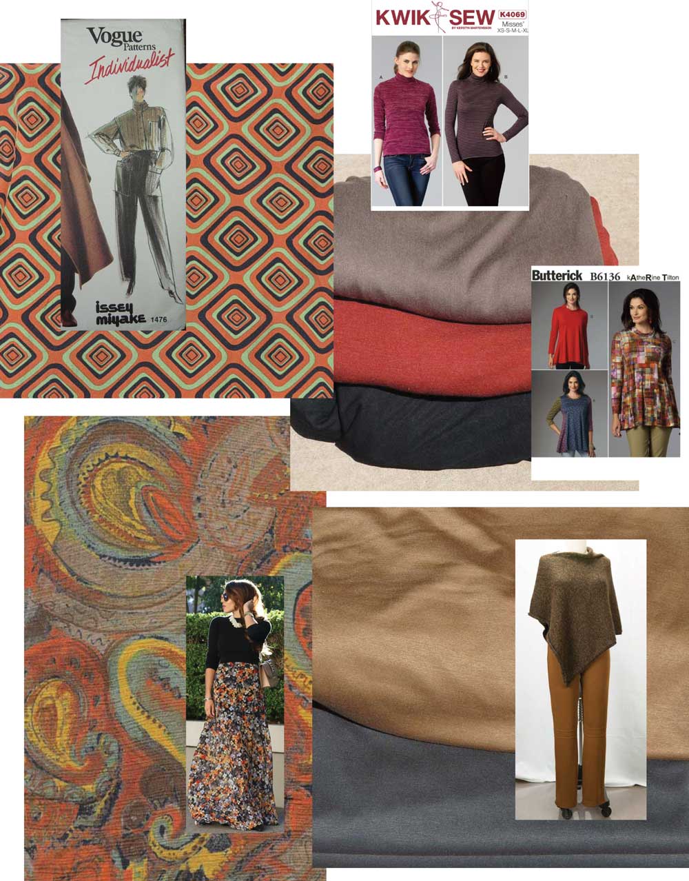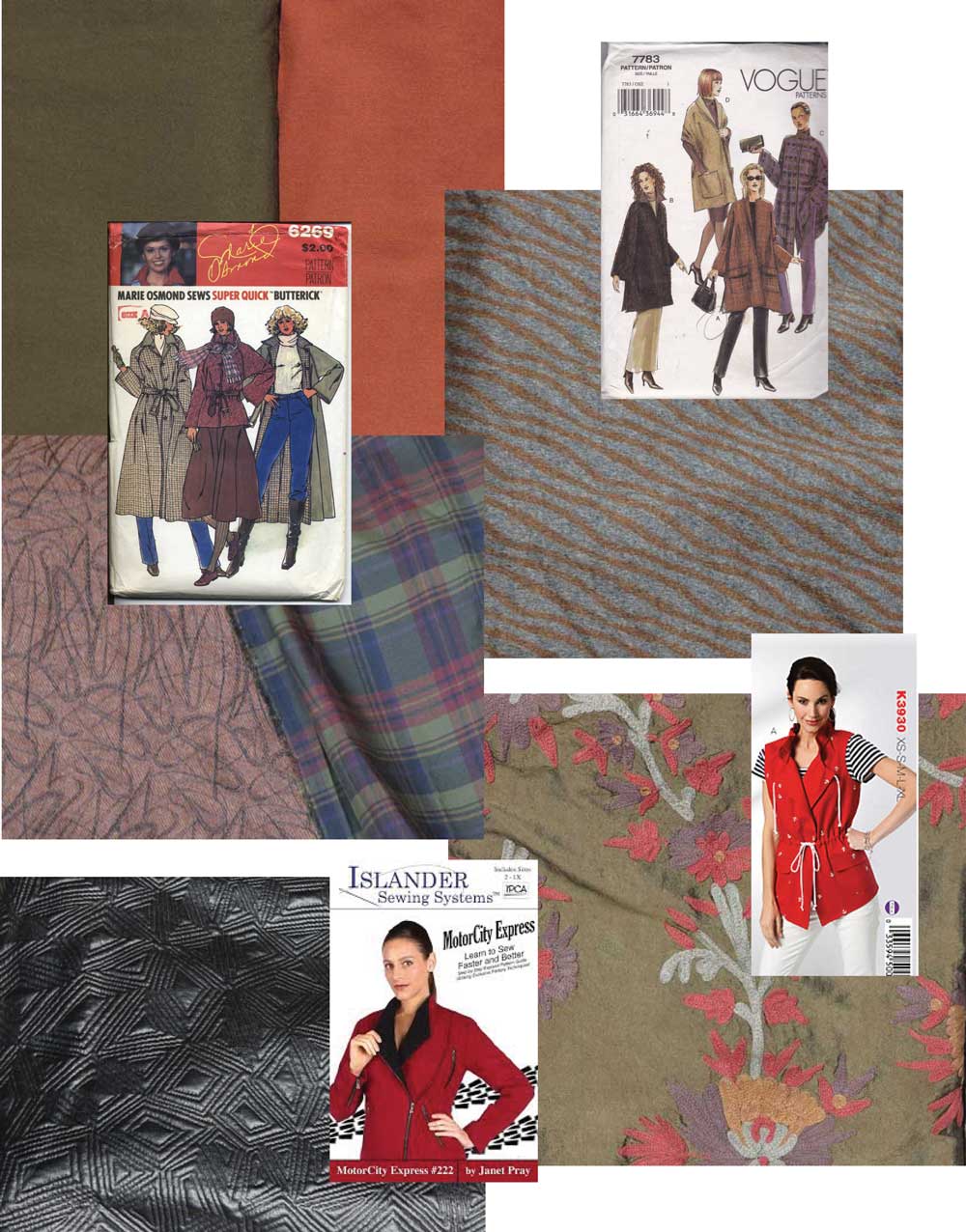 Notes: The zebraesque striped cashmere/wool is yummy soft and came from EmmaOneSock.com. A poncho or ruana is always a practical addition to my fall wardrobe. The hip black plastic coated knit (no longer available) is from MarcyTilton.com and should make a great motorcycle jacket. The pant pattern is Marcy Tilton’s slim pant Vogue 8859.
