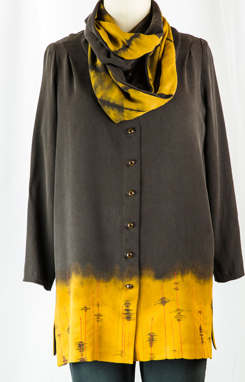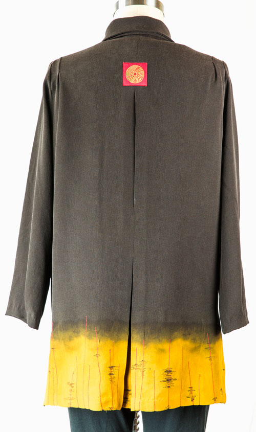 The discharge dying is what really stands out and I had so much fun dipping this beautiful dark brown silk in (horrors!) bleach. Yes, I know silk can dissolve in bleach, but I didn’t have the patience to order the appropriate product from Dharma Trading. I tested about 5 samples, which serendipitously turned mustard yellow a color in my travel palette. I did have a stop-bleach product so at least that part of the discharge process was correct. I decided to go for it. What happened? Some of the shirt panels started to dissolve!! Arggh!…Cool… a design opportunity is knocking.