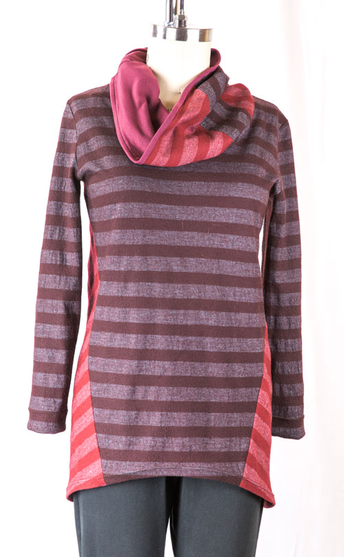 I didn’t have enough fabric so I cut the pieces out with a corner missing, thinking that something could be done with the other color to fill in the missing piece. I think the split tail is kind of fun, so I ended up just leaving it and adding the square on the upper back for balance. I also didn’t have enough fabric for the cowl neck. I pieced both colors for the top, then decided that it would be more comfortable to have cotton knit instead of wool around my neck. I love having a stash in my favorite colors just for something like this!
