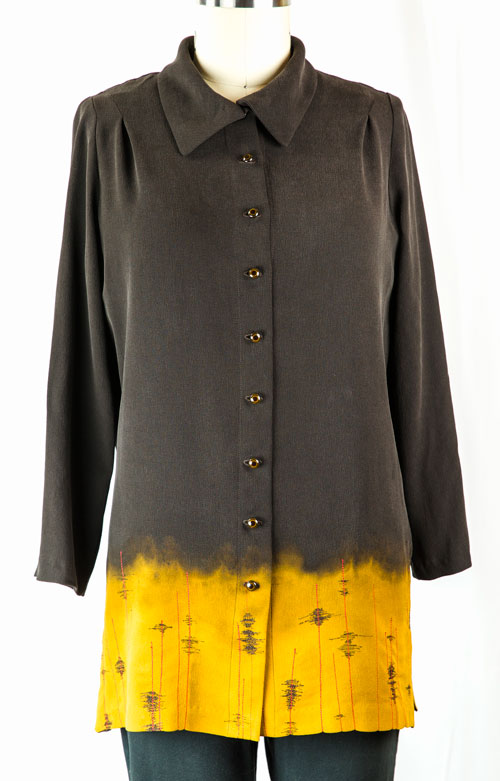 The grey and black tunic from Soft Surroundings (bottom right) is the closest to the shape I want, but I love the bias pleats of the Alexander McQueen shirt (top right). The shapes of these two shirts aren’t completely compatible since the McQueen shirt would be boxy in shape.